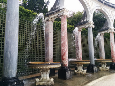 To a soundtrack of classical music piped into the gardens, we made a beeline straight to the Girandole Grove aiming to have lunch first in Brasserie De La Girandole. The prices are reasonable here (considering where you are) and I had the best hot chocolate I've ever tasted! It was delightful sitting under the covered terrace listening to the light rain pinging off the canvas, with the gardens on all sides. The conversation came up again about Marie-Antoinette's motivations for building the hamlet. Sitting there under the canvas, being reminded of camping trips with the Girl Guides in my youth, I wondered were we emulating her crassness by going camping in a world where people were forced to live under canvas through war and poverty? I decided that camping was different. We go camping to reduce our costs and in some cases to get close to nature and have no other option - guilt trip avoided...for now...