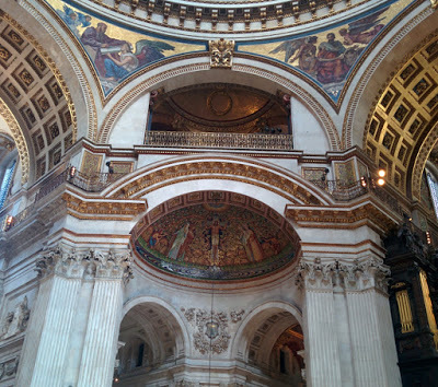 The dome on the inside is smaller than on the outside and the inside is painted with stories from the life of St Paul.