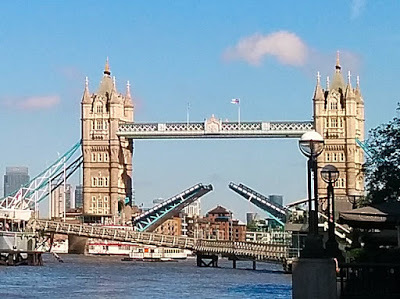 Tower Bridge opening to let river traffic through.