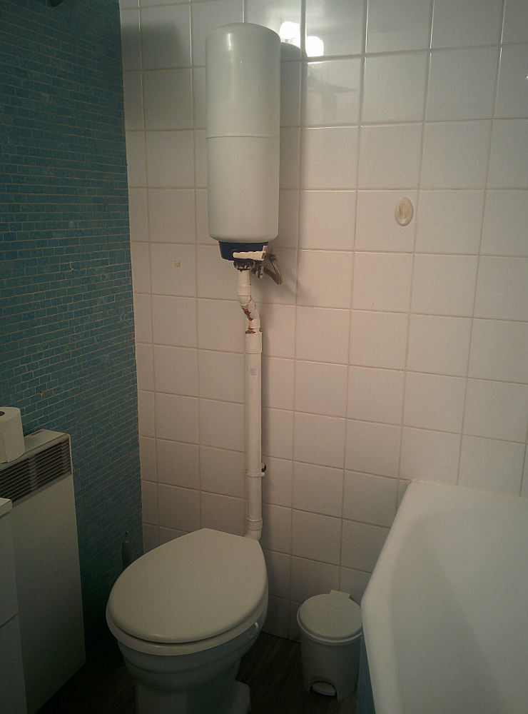 After dinner we took stock (in a non-complaining, giggling way) of our digs. We'd gone cheap, not knowing how long we'd have to pay vacation rental prices. In the cold light of the electric lamp in the corner (for some reason there was no pedant lamps in the center of the rooms) we could see the place was tiny but very clean. It was called an apartment but really it was a studio. It was also kind of weird. The cistern for the toilet looked like a scuba tank.