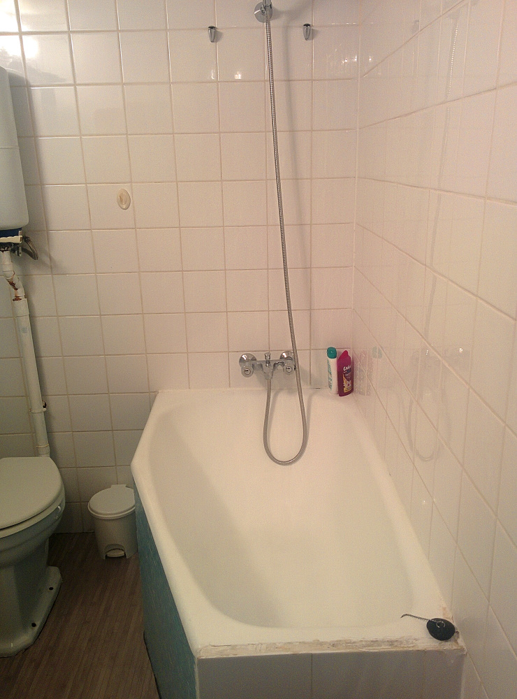 The bathtub must have been custom made. Not only was it extra short, but a piece had been sliced off it too, so it was tapered on one side.