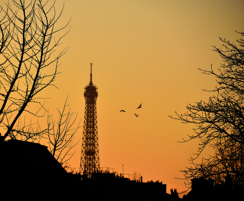 To the right, you can see the Eiffel Tower twinkling over the streets of Paris.