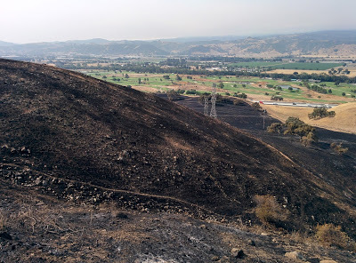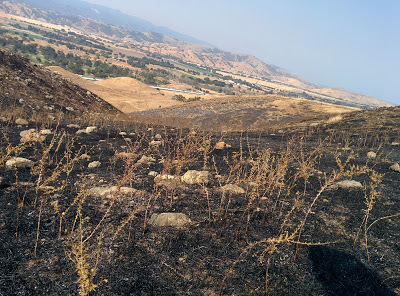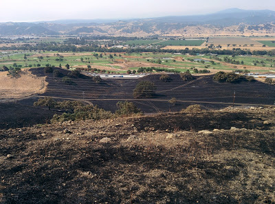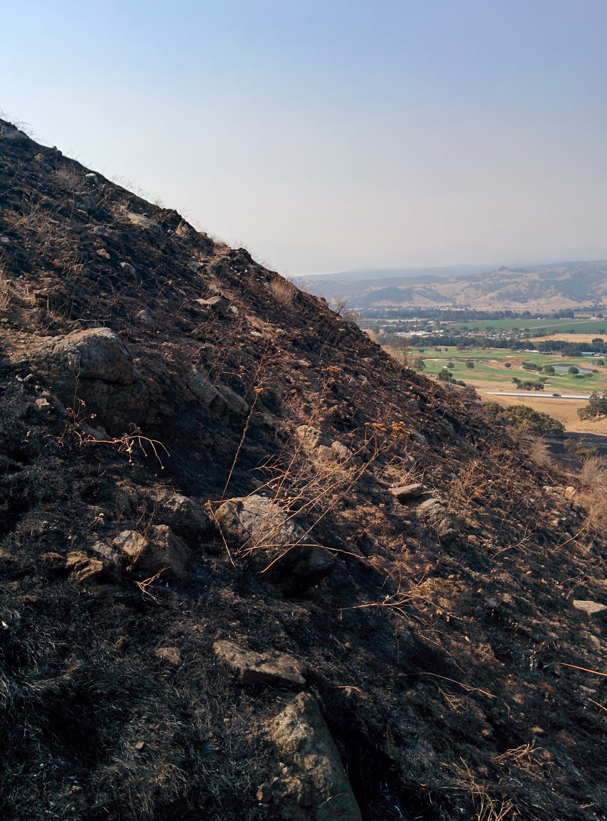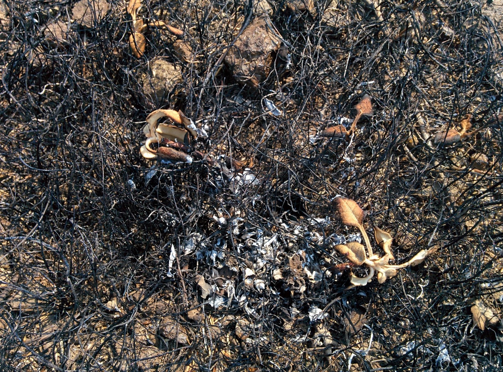 This is where the fire can benefit the California natives. It clears out all the (mostly non-native) plants such as grass. The natives, dormant and in seed at this time of year have more room to grow when the rains come and germinate the seeds. In fact, the fire even helps certain seeds to germinate.