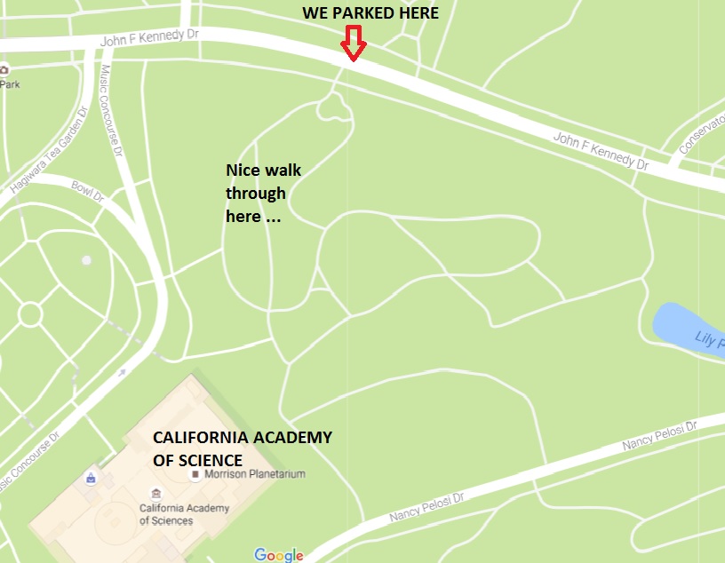 The parking fairies favored me with free parking in a relatively close-by spot on John F Kennedy Drive between Music Concourse Drive and Conservatory Drive West.