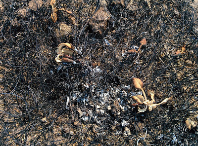 At first glance the fire seemed all consuming, but up close you could see that while the vegetation was scorched and burned, the soil wasn't. Here is where the caterpillars are hiding until the rainy season... waiting for their food sources to germinate and grow.
