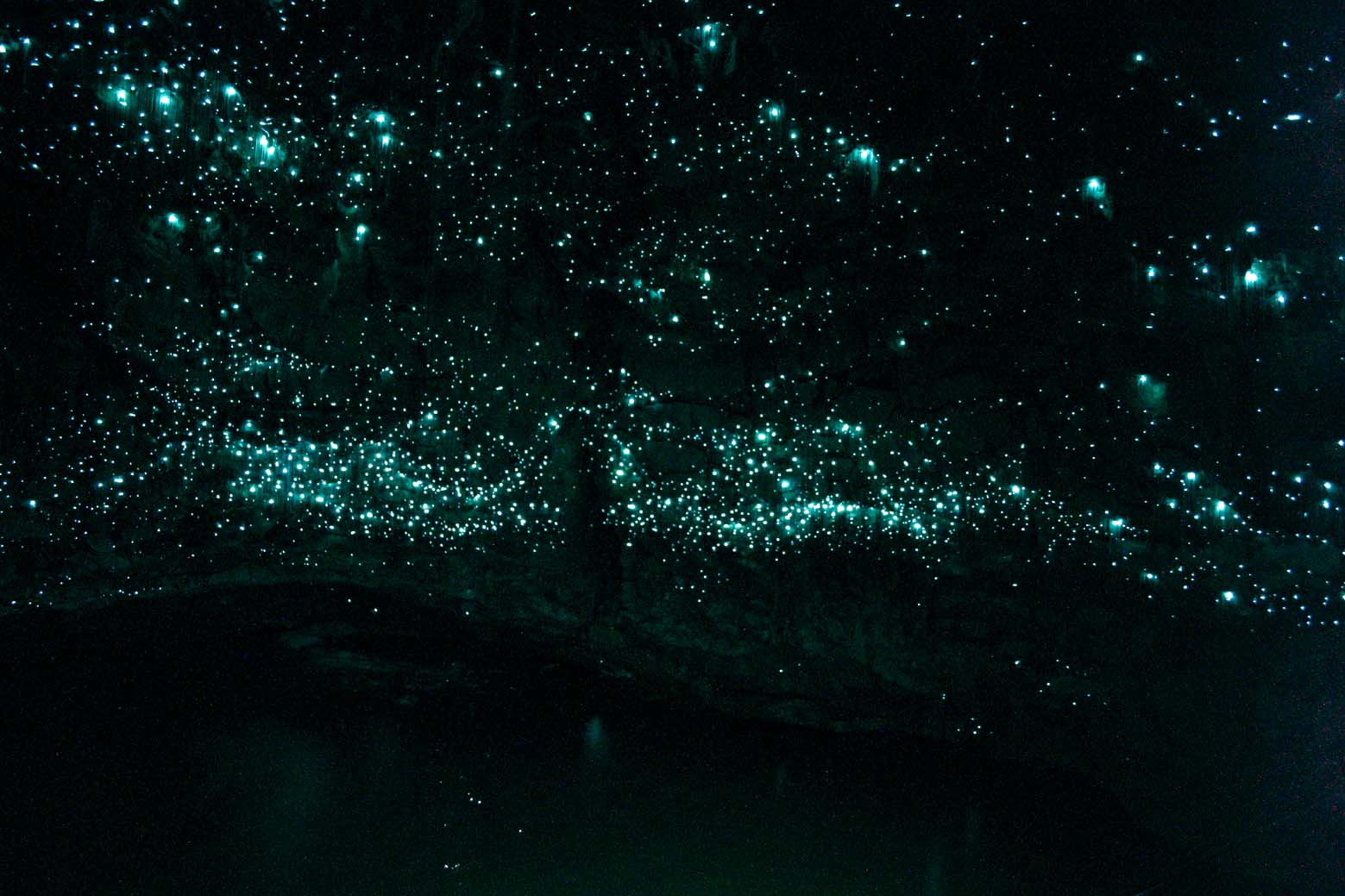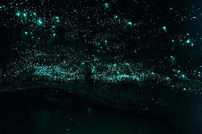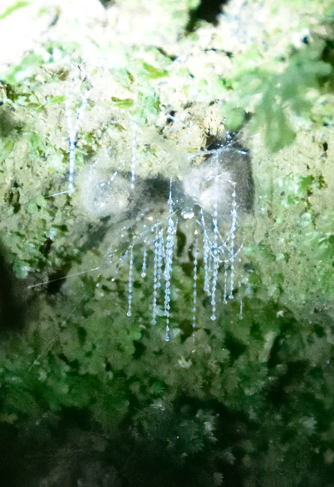 Glow worms are actually the larval stage of a type of fly that dangles sticky threads. Their light attracts flying insects that get stuck in the treads. The larvae then reel 'em in and scoff 'em!