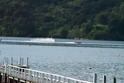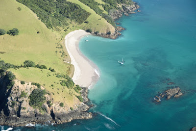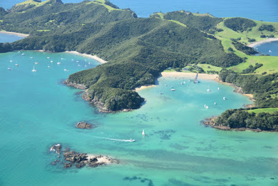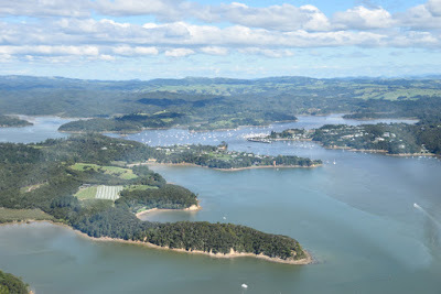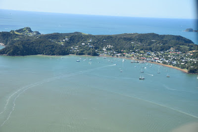 In the photo above you can see where the recent rains has washed sediment into the blue waters near Paihia but not reaching the town of Russell, across the bay.