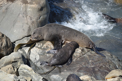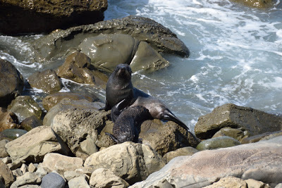 At one point we stopped to get out and take pictures. We were out of the car and overlooking a small cliff-like drop of about a dozen feet when I noticed fur seals on the rocks - a whole colony of them in their hundreds, stretching all along the coastline.