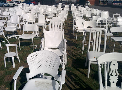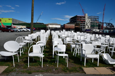 185 white chairs sit on a lot in the city. Each chair represents a person who died in the earthquake. The variety of the chairs, some high chairs and baby seats, shows the uniqueness of each life lost - death is not choosy. The earthquake did not discriminate.