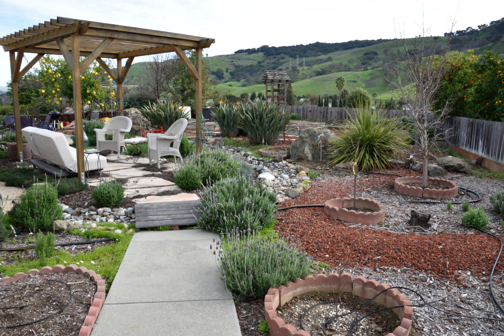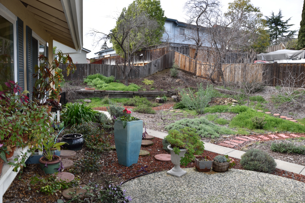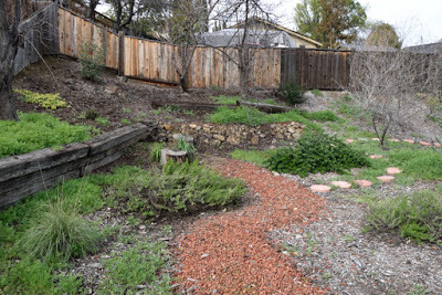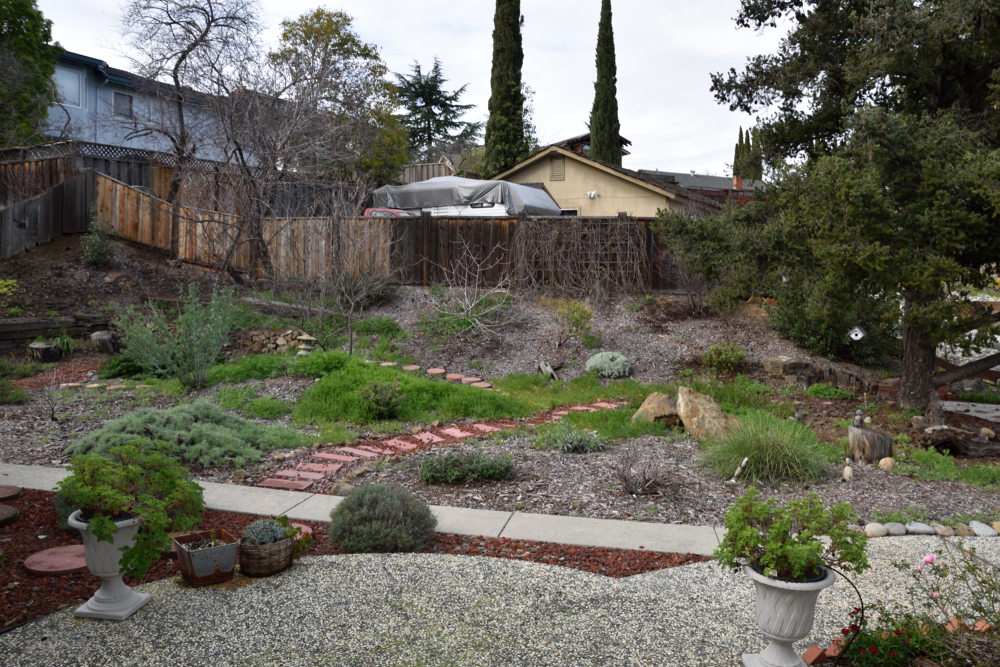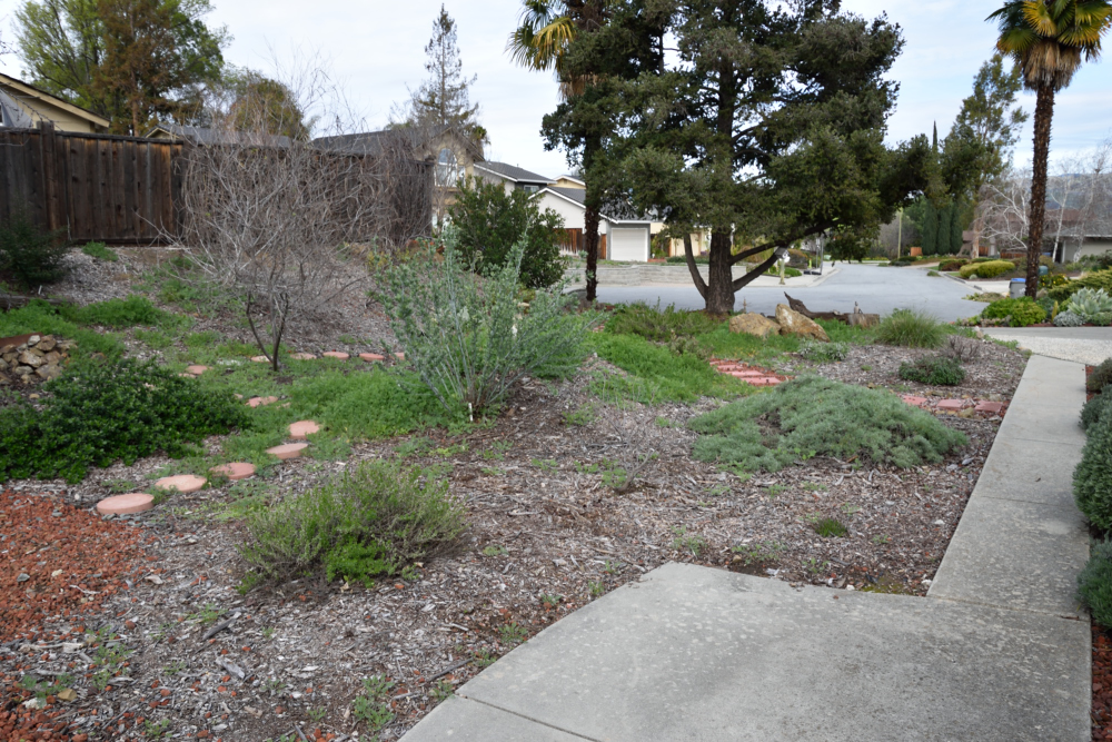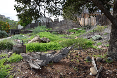 So we left on February 5th to embark upon our South East Asia and New Zealand adventures and returned 7 weeks later on March 29th. I didn't plant a winter veggie garden since I'd not be here to harvest it, but the native garden stole the show. In the following couplets of photos the one on top was taken on February 3rd and the bottom one was taken on March 30th.
