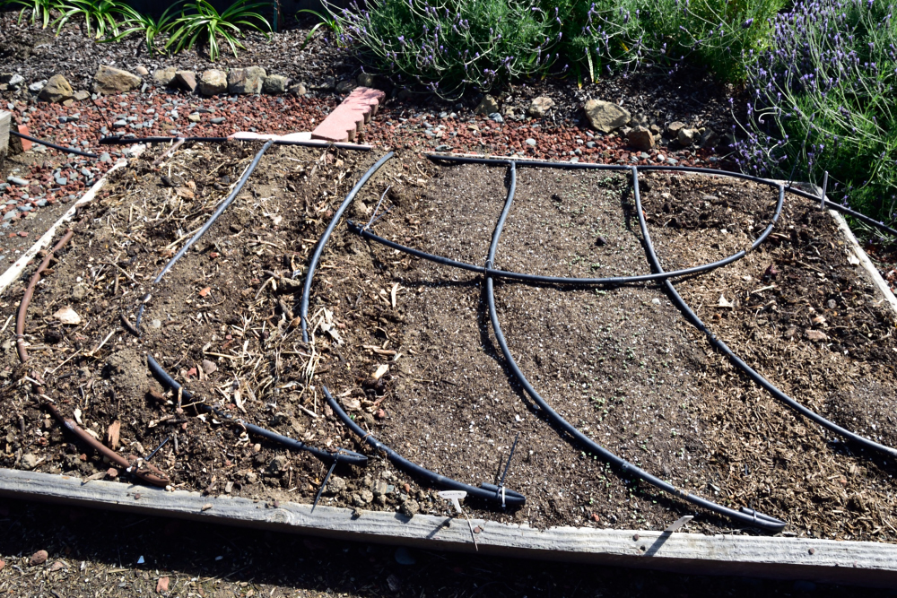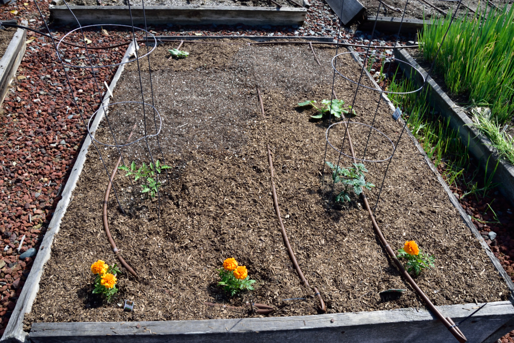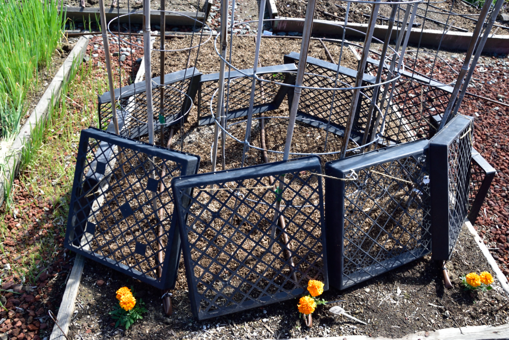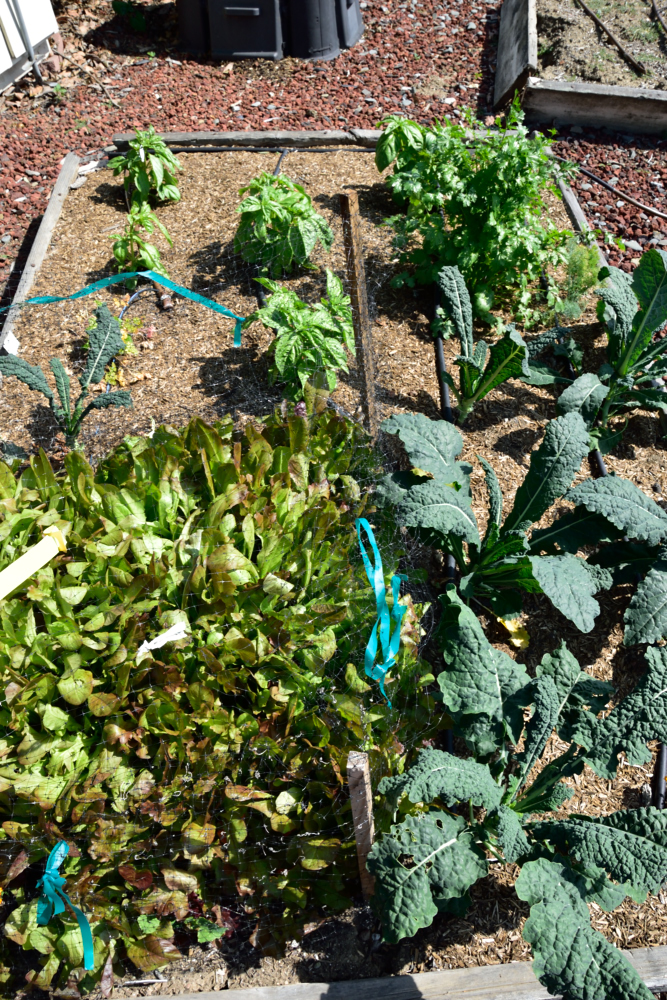 Lettuce seeded and protected with netting and seedlings planted for basil, cilantro, dill and kale.