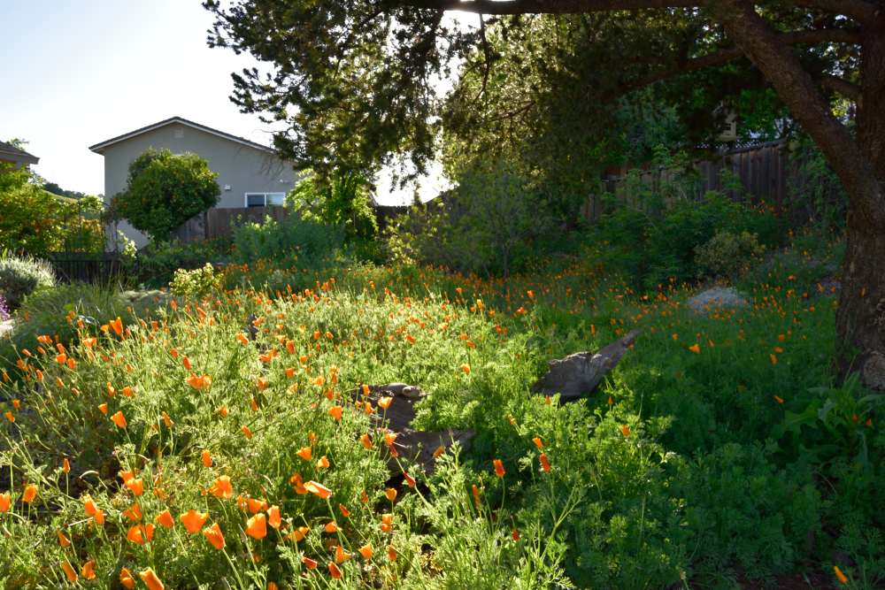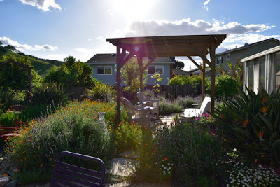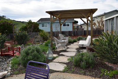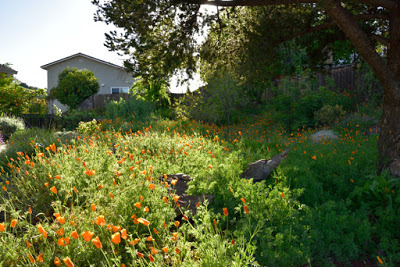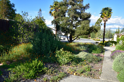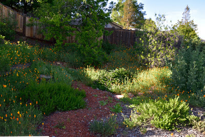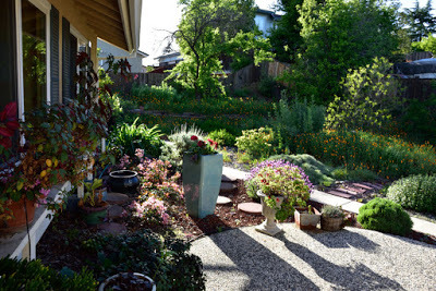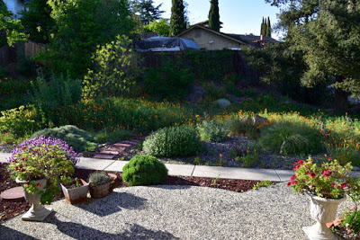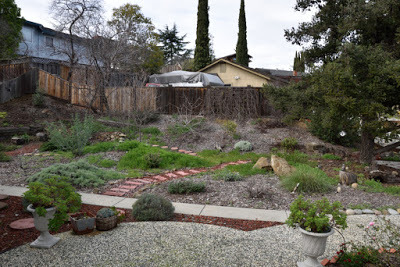 The garden on May 12thIf I went chronologically, I'd probably not get to posting this until the autumn and in gardening terms that's just too out of whack.So we left on February 5th to embark upon our South East Asia and New Zealand adventures and returned 7 weeks later on March 29th. I didn't plant a winter veggie garden since I'd not be here to harvest it, but the native garden stole the show. In the following couplets of photos the one on top was taken on February 3rd and the bottom one was taken on March 30th.