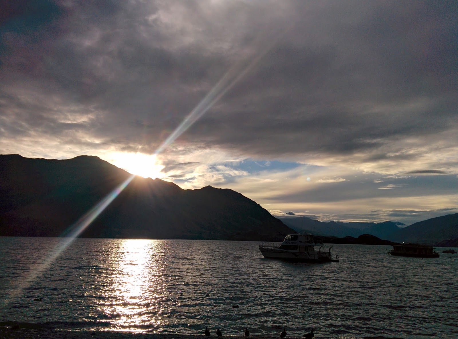 We started out before sunup at silly o'clock, shivering at the side of the road waiting for our bus to pick us up and wondering if we'd been insane to spend all that money. The half hour bus ride to the lakeside thawed us out and as we crossed Lake Manapouri the sun rose.