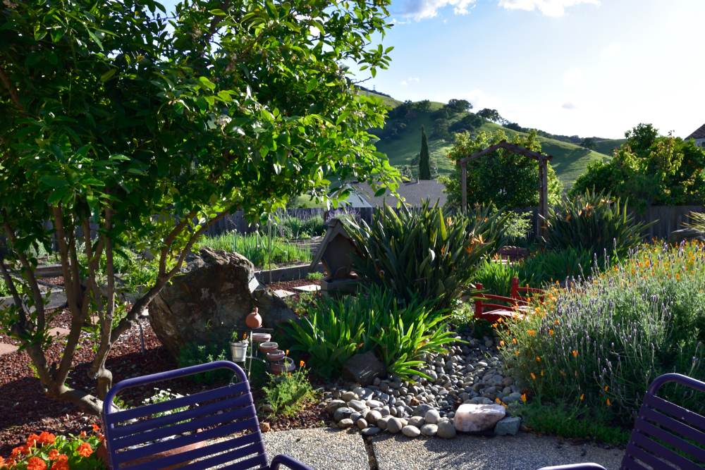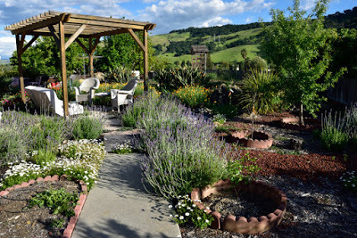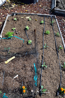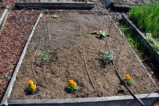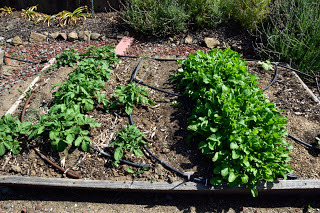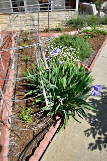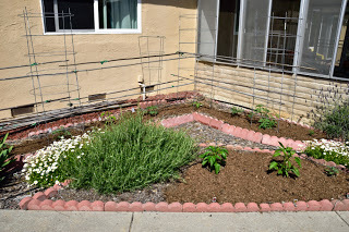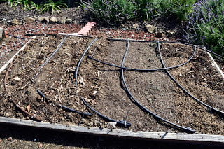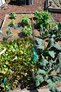 At the end of March we came back to California and stayed for two weeks - during which time I put in some summer seedlings and planted some summer vegetables. Here's what four weeks did to the veggie garden!Lettuce seeded and protected with netting and seedlings planted for basil, cilantro, dill and kale.
