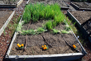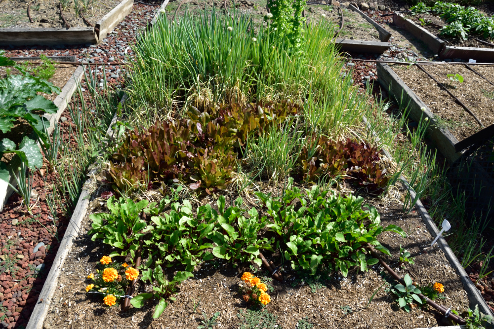 The scallions are already reseeding themselves and pretty much growing wild. I pulled a few and made an "island" for lettuce hoping that the smell of the onions would disguise the lettuce from snails and squirrels. Seems to have done the job. I have beetroots from seed in the foreground.