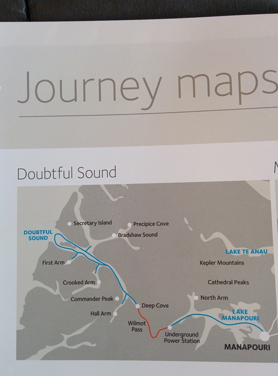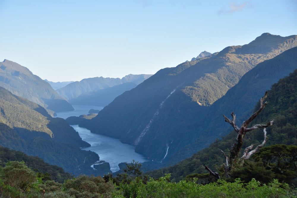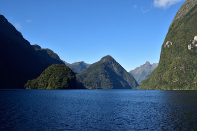 The bus ride over the Wilmot Pass to Deep Cove only took about a half hour and it stopped at the top for a view of the sound. Note the clear blue sky. We were told that happens about five times a year. How lucky were we?