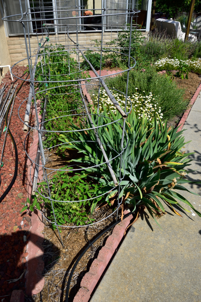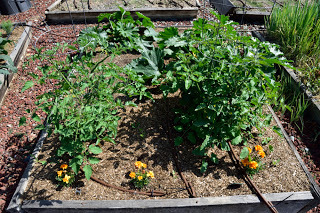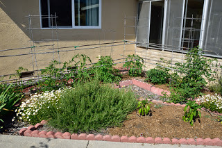 Tomatoes behind and peppers in the foreground - the rosemary bush lives there all the time.