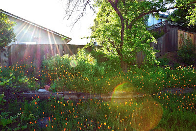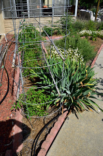 At the end of March we came back to California and stayed for two weeks - during which time I put in some summer seedlings and planted some summer vegetables. Here's what four weeks did to the veggie garden!