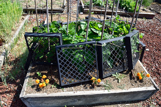 I put these plastic tray up to protect the runner bean seeds from the birds and squirrels - I should have protected the lemon cucumber further back in the plot - they are struggling but you can't seem them past the beans today.