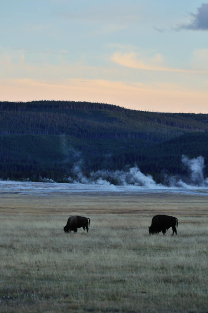 As the sun sizzled in the snow caps tucked behind the horizon, we went to watch the steam thicken from the geysers as the air temperature dropped, tripping over more Bison on the way.
