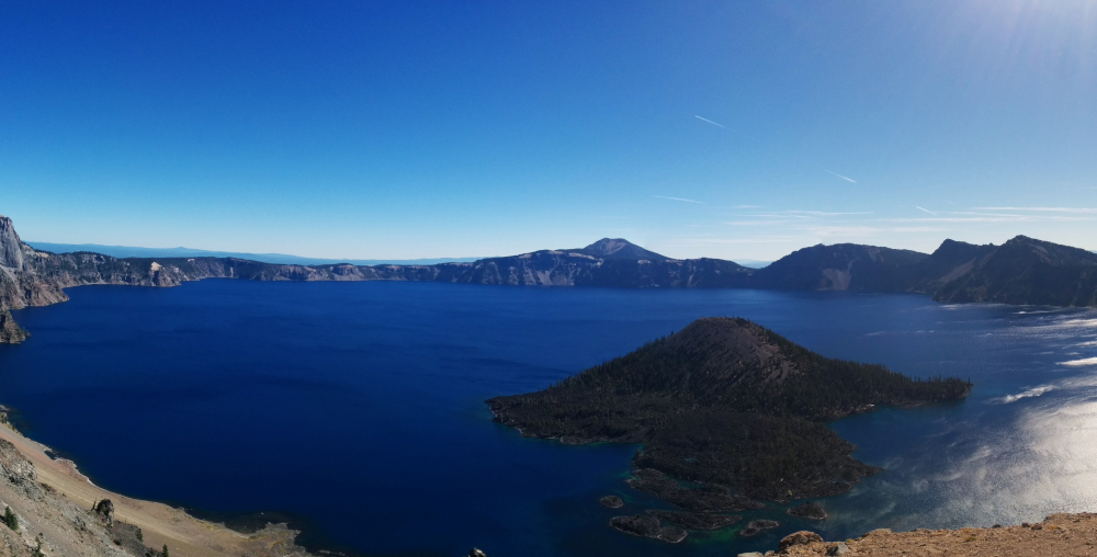 First stop - Crater Lake, formed when a huge volcano called Mount Mazama erupted in 5700BC and then collapsed in on itself. The eruption threw up 150 time more ash than Mount St Helena's 1980 eruption. The resulting Caldera filled with water. It has no rivers that run into it and its only catchment is direct precipitation. It is the deepest lake in the USA.It is huge. I couldn't even get the whole thing in using my panorama app on the phone (without the image getting warped.)