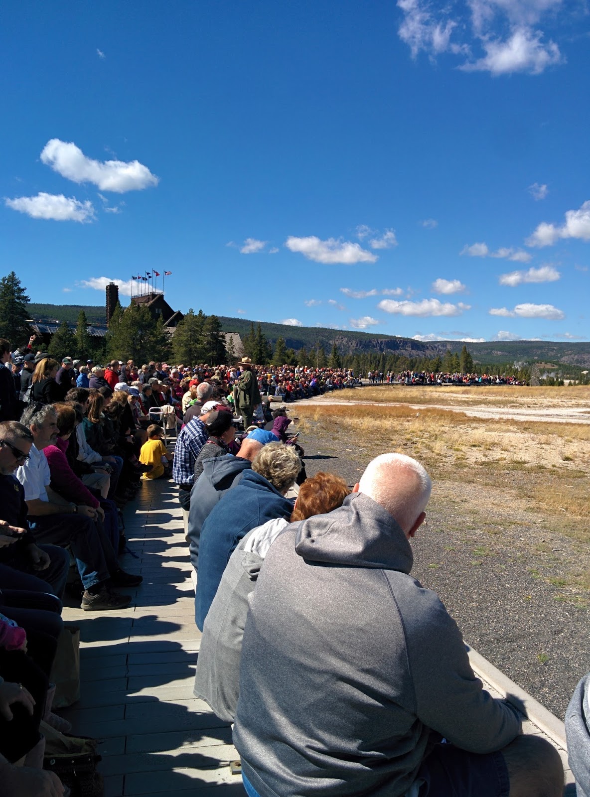 But that was far from the case when we got to Old Faithful. The visitor’s center lets you know when the next eruption will take place. As we waited with about 500 others, kids ran around screaming, parents halfheartedly yelled at them to behave (of course, they were on vacation too, only fair they get a break from disciplining their off spring too, right?) Beside us, a curmudgeonly old man grumbled at some young woman he’d never met before, for setting up her tripod stand in front of his seat, even though his wife kept telling him he’d be standing once the darn thing blew. The tripod stand was only two feet high. I felt like saying to him, “Calm yer jets!” But I was afraid I’d be the only one finding that funny!