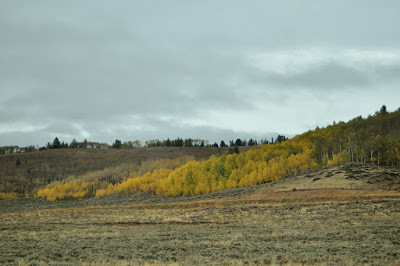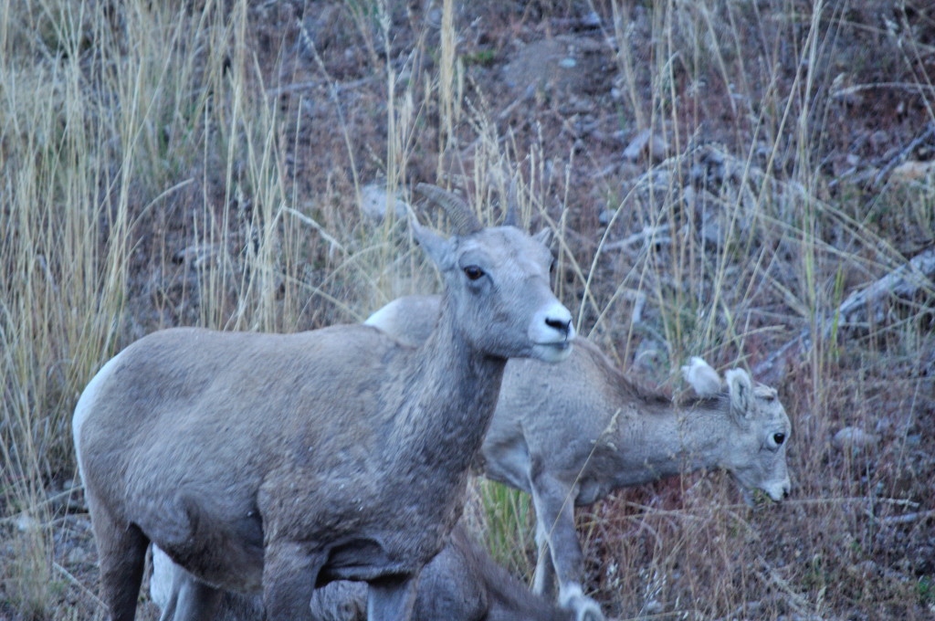The grizzlies love the transition areas between the trees and the grassland. We didn't see any. We tried not to be disappointed, but we were really bummed when we arrived at the place in Tower-Roosevelt that the map told us served food, only to discover it was closed for the season! We were 2 hrs from West Yellowstone. We wouldn't starve in two hours, but we were getting hungry and grouchy, we 'd be a good match for any grizzly! However, all we saw along the way home were these long horned sheep...