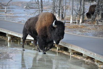 Further down a ranger shouted at people to stay on the board walk. Good job he hadn’t seen last night’s Bison, though he’d have been more biddable than some of these frantic tourists.