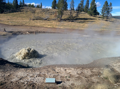 Before we got to Old Faithful we stopped at the various geyser areas on the road south from Madison as we came upon them. Parking was challenging at most of them. One we gave up on, the Prismatic Spring - third biggest in the world and biggest in Yellowstone... We'll survive not seeing it - perhaps we'll just go see the biggest one in the world, though an internet search as to where that is pulls up a few different answers - maybe just safer to visit them all! Still, we saw plenty of geysers and hot springs that day.
