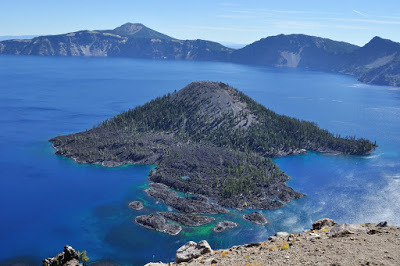 Can you imagine being the first person to find this? There is a place called discovery point, where the first European came across it. Of course, he was not the fist human to find it since there were people already living here - a fact conveniently glossed over far too often. Even so, I tried to imagine what it must have been like to climb up the rise and see this for the first time if you hadn't expected it to be here. It was pretty impressive even from a car and knowing there was something here.Inside the crater, Wizard Island is the tip of a drowned volcano that rises from the lake floor. You can take a boat trip out to it, or swim!