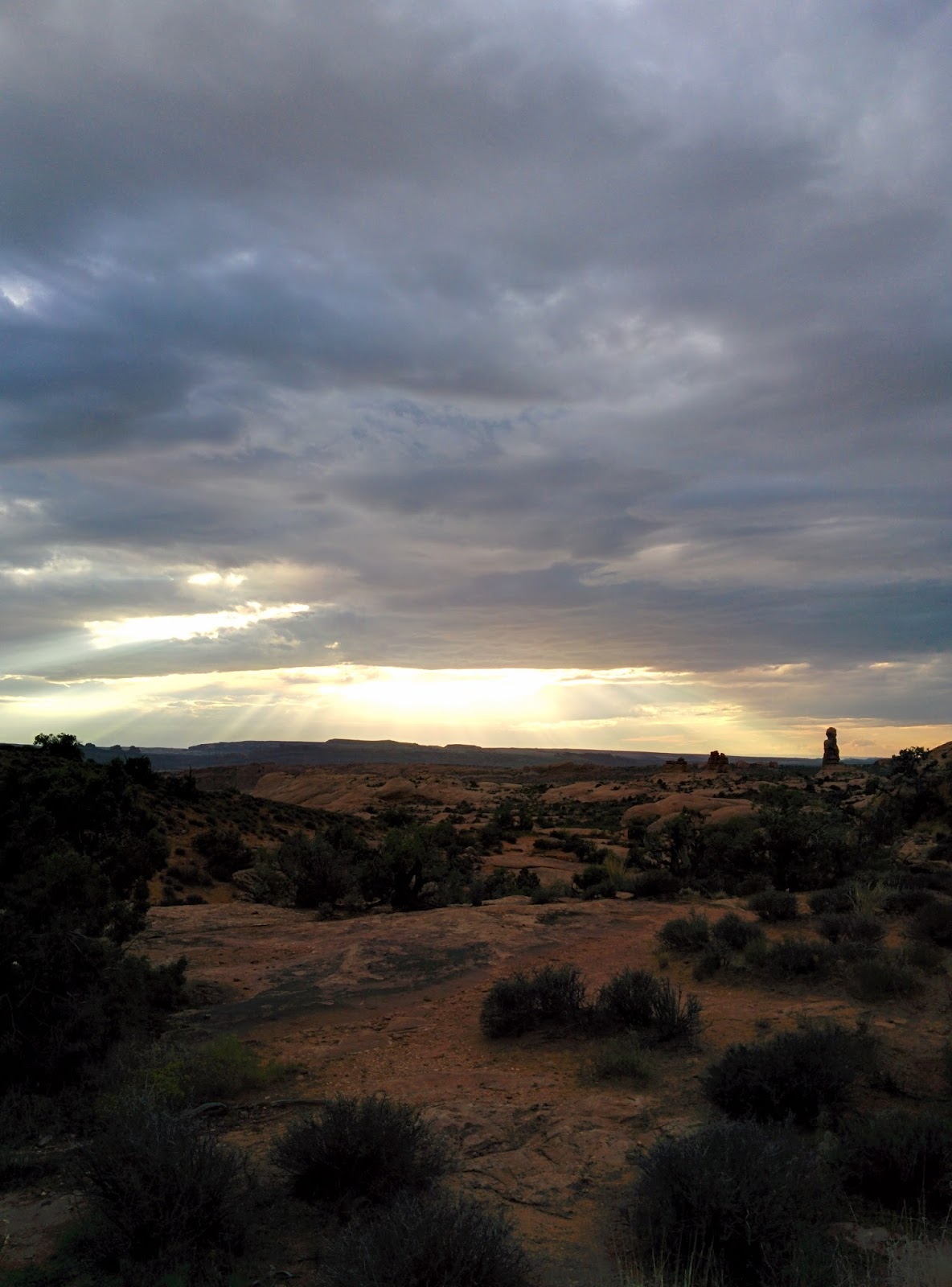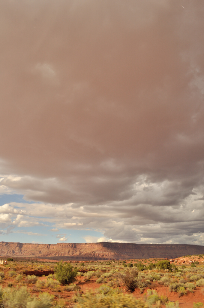 So we decided to break our “no road tripping in the dark” rule (well, rules are made to be broken!) and blasted the 81 miles straight to Moab. Once there, we’d have made up the miles we’d lost the day before and even have gained some, since that was our port of call the next evening as well. Two nights in the one spot! That’s a commitment, next thing we’d be checking out real estate…As night fell, a bolt of lightning on the horizon lit up the sky in a yellow flash! What a treat. We continued to reel in natures splendor as another bolt cracked open the sky on the other side of us. Rain lashed the car, and the windscreen wipers got the best work out ever. We were so glad we weren’t camping! Another cloud, white and billowy, unlike the others lit up in a golden glow. This, My Husband told me, was an electrical discharge within the cloud. I’d never seen anything like it, more used to sheet lightening in Ireland and rarely seeing any in California.