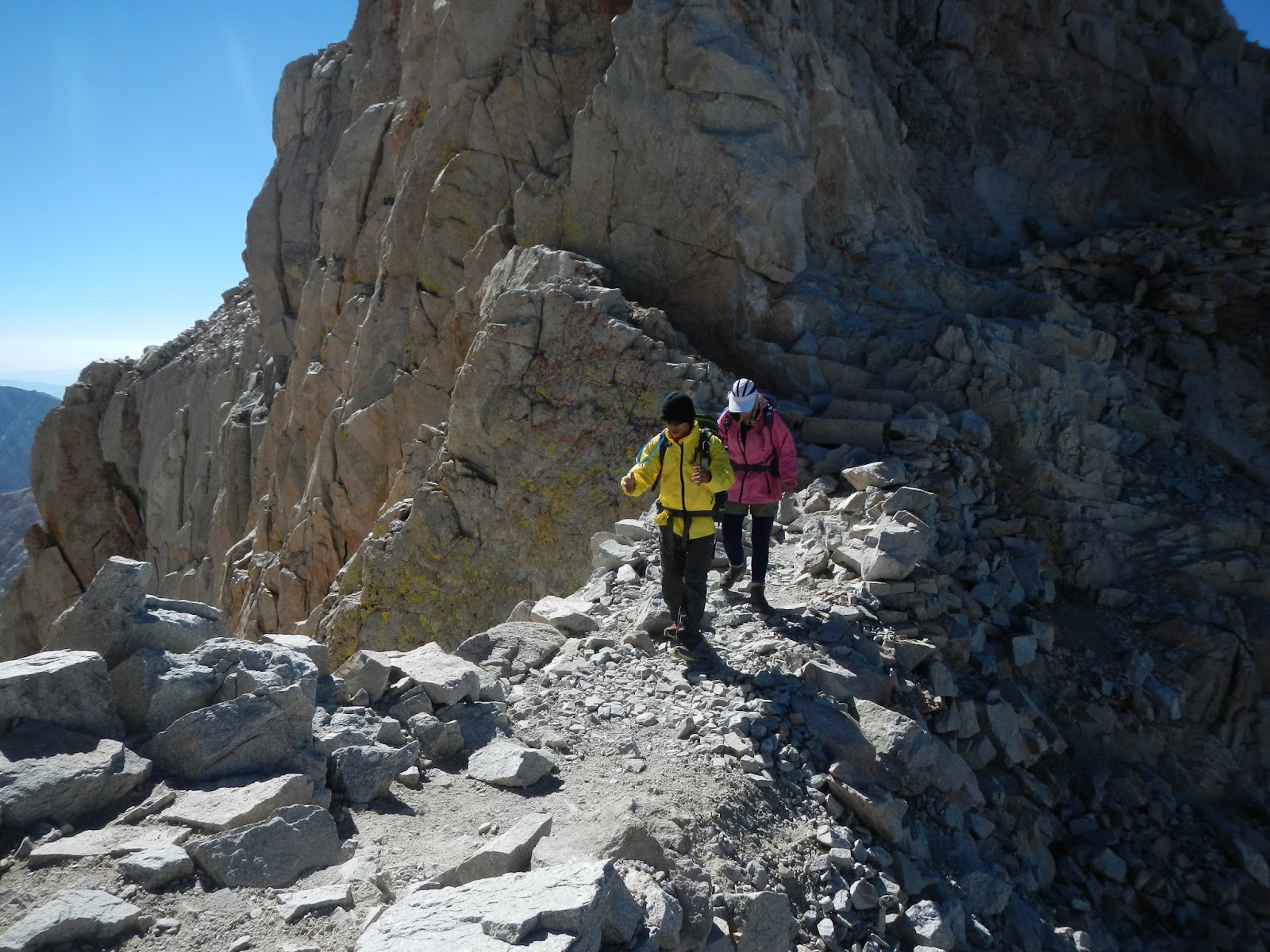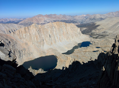 When I look back, I feel like it didn't take that long to get up to that first ridge. At Trail Crest, where you go over the ridge and slide in behind the sky-piercing peaks, Superman - now firmly established as our mountain guru, advised us to don a thin fleecy and a wind proof jacket.