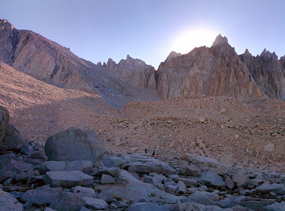 As a metaphor for life, Whitney has it all. Getting to the top is just half way there. You aren't done until you are back down and for someone who feels that they are half way through life, like myself, it's okay if its "downhill" from here. Downhill is not a bad thing. Downhill is where the breathable air is, the place where you can reflect on the journey uphill and what it's like at the peak. It's were the vineyards, flushing toilets and ice dispensers are too. For some, climbing high may indicate success, but I'm not sure I agree - it's by no means comfortable up there. Lushness and beauty lie in the lower slopes. High up, the peak is exposed and the rocks bare. Success is enjoying wherever you are, high or low. And remember, no matter when or where it happens, you still have to carry all your shit with you, uphill or down.
