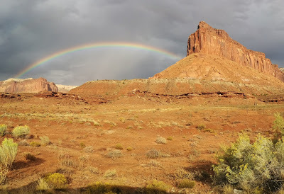 The most special moment in a day that had already set the bar high for special, was when a double rainbow sprung up, contrasted perfectly against pewter clouds above a gigantic red wall of rock. By the time we’d screeched to a halt (the road was empty so we just stopped right in our tracks) and gotten out, the double rainbow had merged into one with more vivid colors than I’d ever seen before.