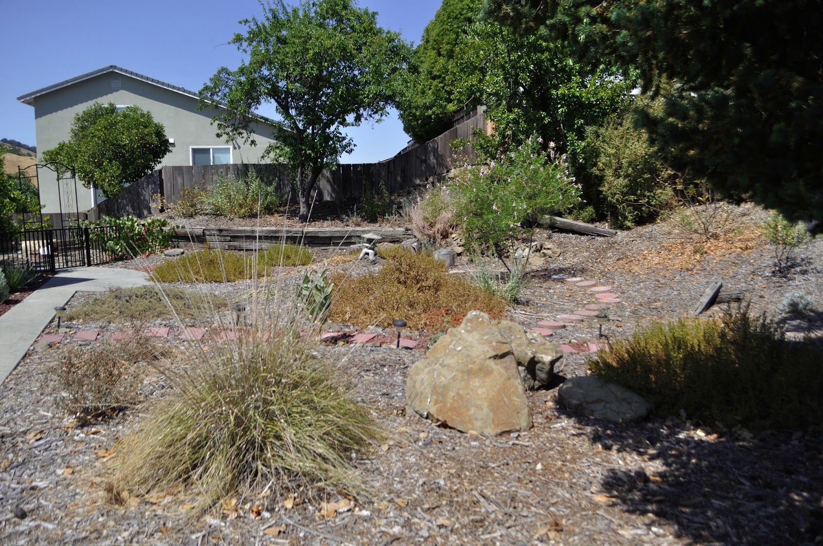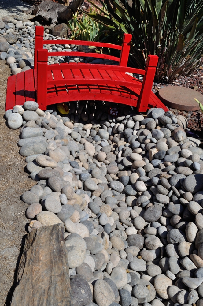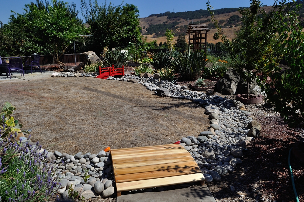 After solarizing the lawn, my friends helped me build Wee Lee Canyon, a dry creek around the what used to be the lawn. Another friend, and very talented carpenter, constructed
