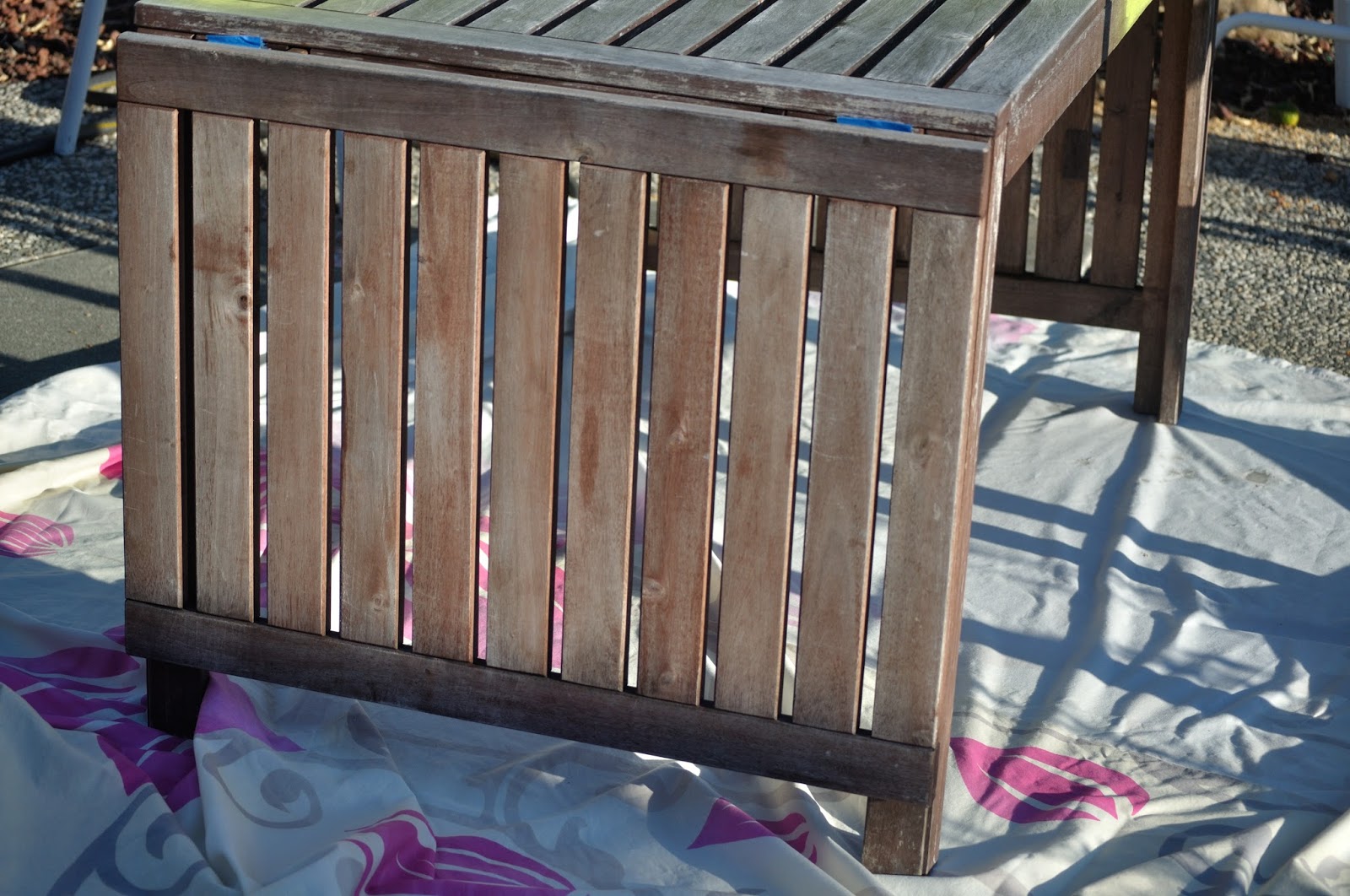 Since so much of the back of the house is windows, I think it important that the furniture looks nice. The furniture we have right now is extremely practical. The table came from Ikea about four years ago. It can double in size, and I've comfortably seated 14 people for dinner around it. But the sun had weathered it to a dull grey/brown color.