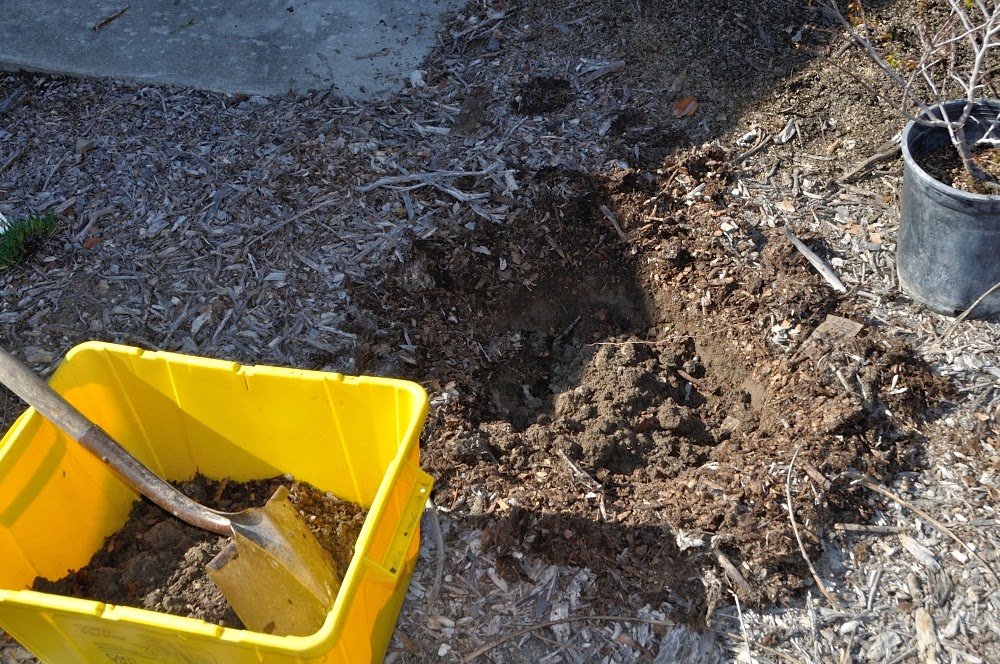 I never usually buy big plants, but it was the only one left in the store. At $49.99 I must have visibly quaked at the the price because the sales guy gave me $20 off on the spot!As I dug the hole to plant it I was struck by how nice the soil was. Four years ago this was compacted, tried old lawn, now it crumbles like chocolate cake - yummy! Take note those of you who don't believe that a layer of cardboard, a six-inch layer of mulch and time to let the earthworms do their thing can produce great results - without removing sod and double digging! You can see the new plant in the top right hand corner of the photo.
