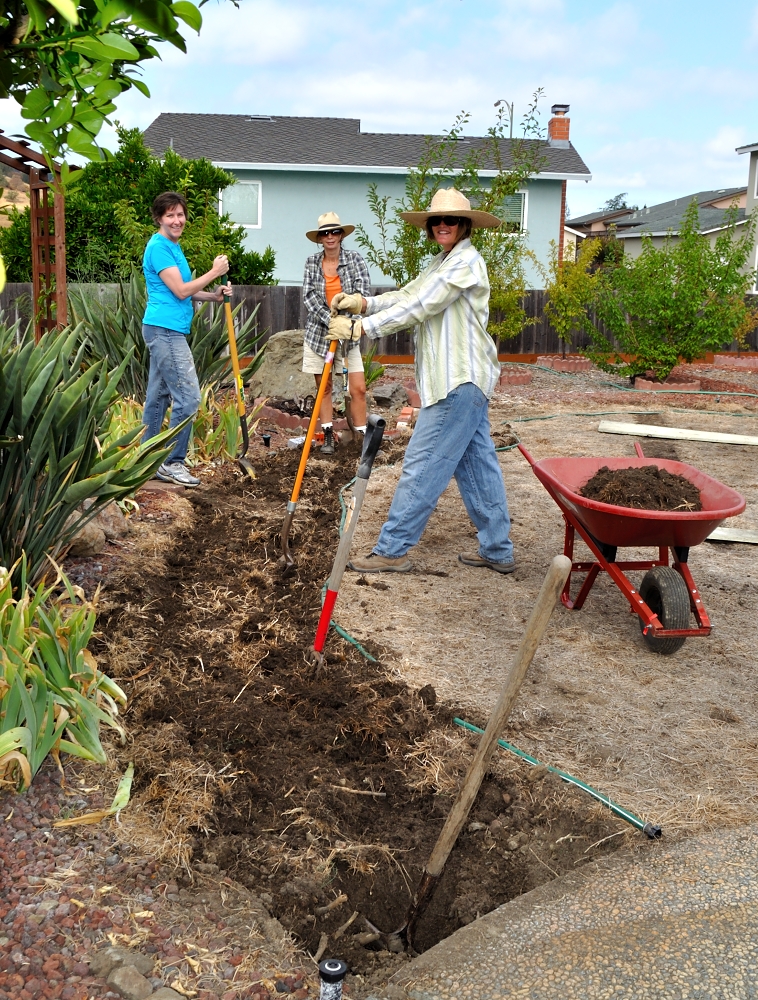 Within three hours of girl power, my friends Cathy, Eva and Christal (from left to right in photo) had it dug! I helped too, but as project host, it seemed that I ended up with all the fiddly wee jobs, like putting air in the wheels of the wheelbarrows, (Okay - wheeling the them over to Al's house and asking him to put the air in them) providing water and snacks, and managing where the soil would be dumped - soil seems to expand fourfold when dug up and I used the soil to make a new bed along the back fence...