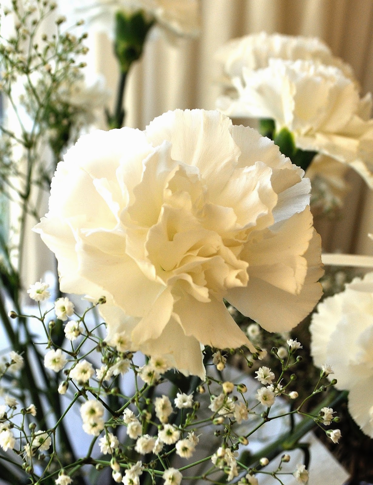 We had a New Years Eye Party, and as part of the "Black and White" theme, I made up a number of white flower arrangements to place around the room. Most of the flowers were carnations (all bought in, not homegrown sadly!) but I had a few chrysanthemum in there too with some Gypsophila Babys Breath.