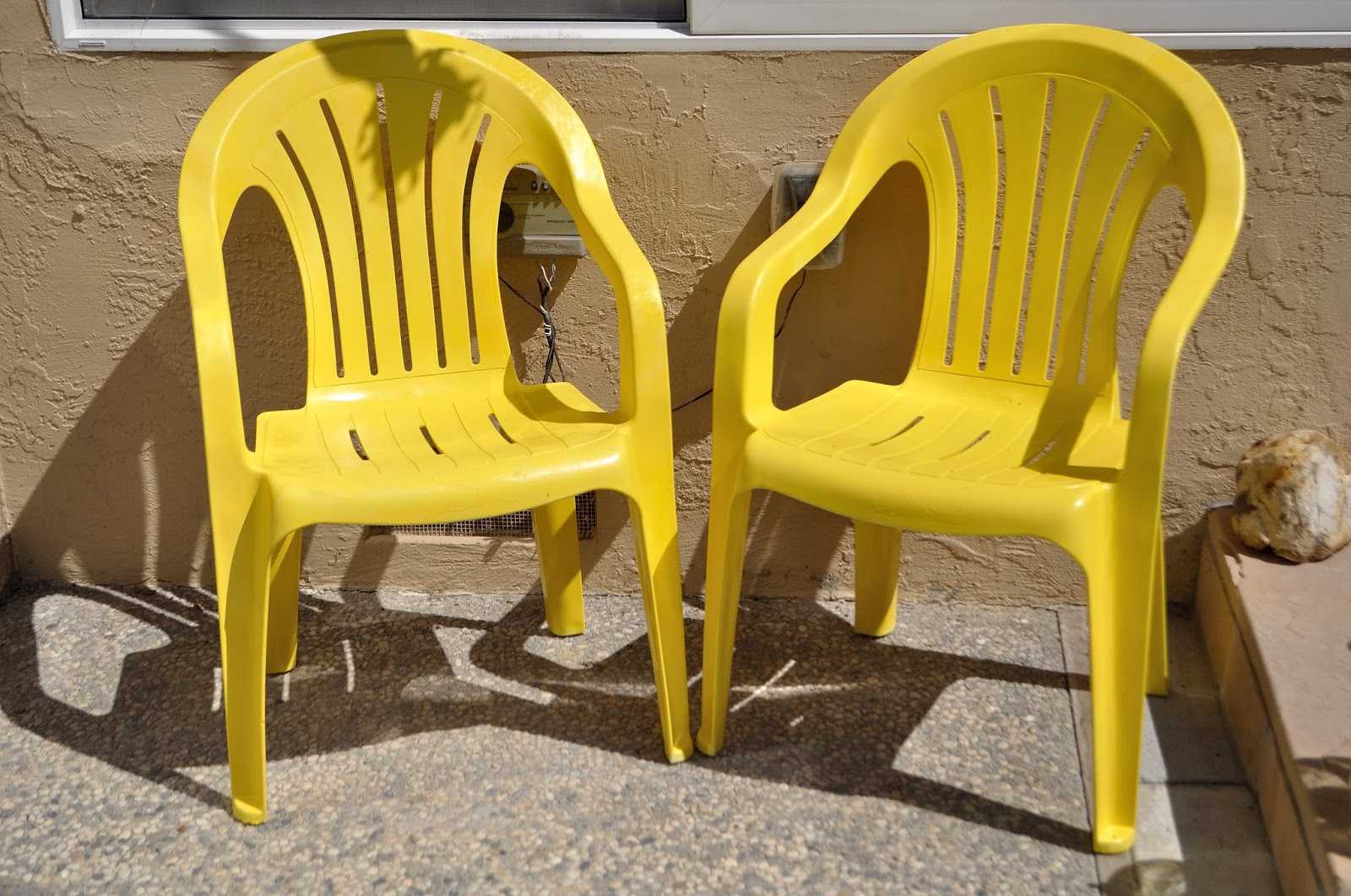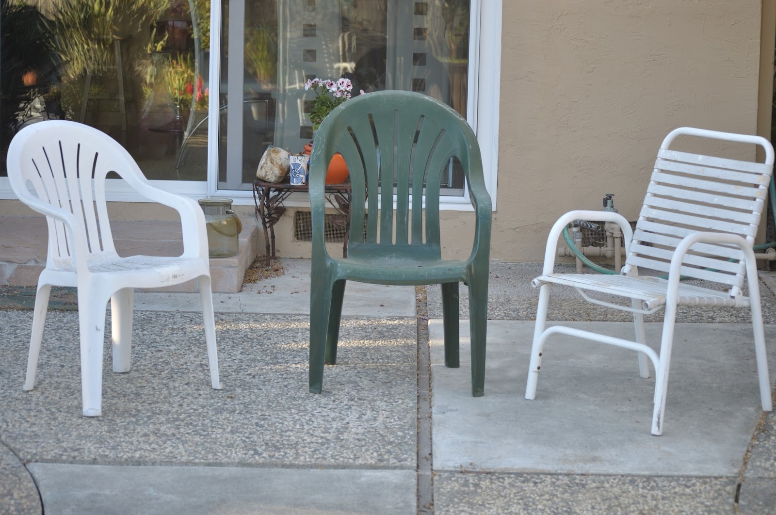 Four years ago, I fished two white ones (left in the photo) and four green ones out of the dumpster at our old apartment just as we were moving to the new house. The four tube metal white ones (right) had been set out for the taking on a nearby kerbside. So I had ten chairs all for free!