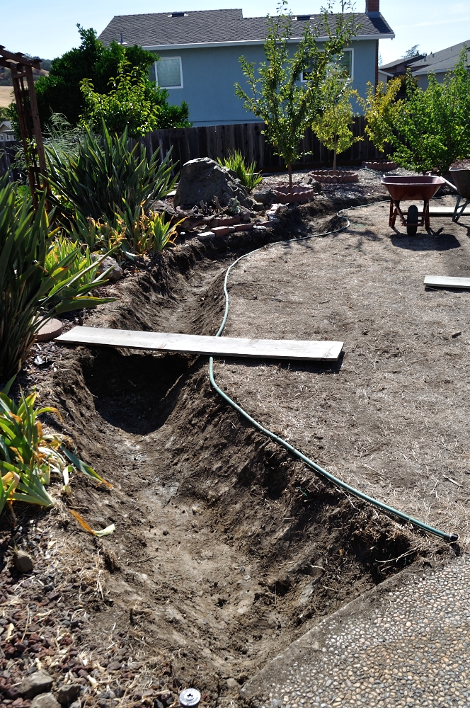 My friend Christal wisely suggested that I should have the wide-end closest to where we did most of our sitting around, and thus cash in on the perspective, so that the far-away side would look thinner and farther from us.I'd read online that a dry creek needs to be half as wide as it is deep. Mine would be 3 feet wide at it's widest point, and therefore 18 inches deep. In hindsight, since my creek is only for decoration, and I do not anticipate it filling up with water, I could have gotten away with it being less deep but specs were specs and that was how it had to be.