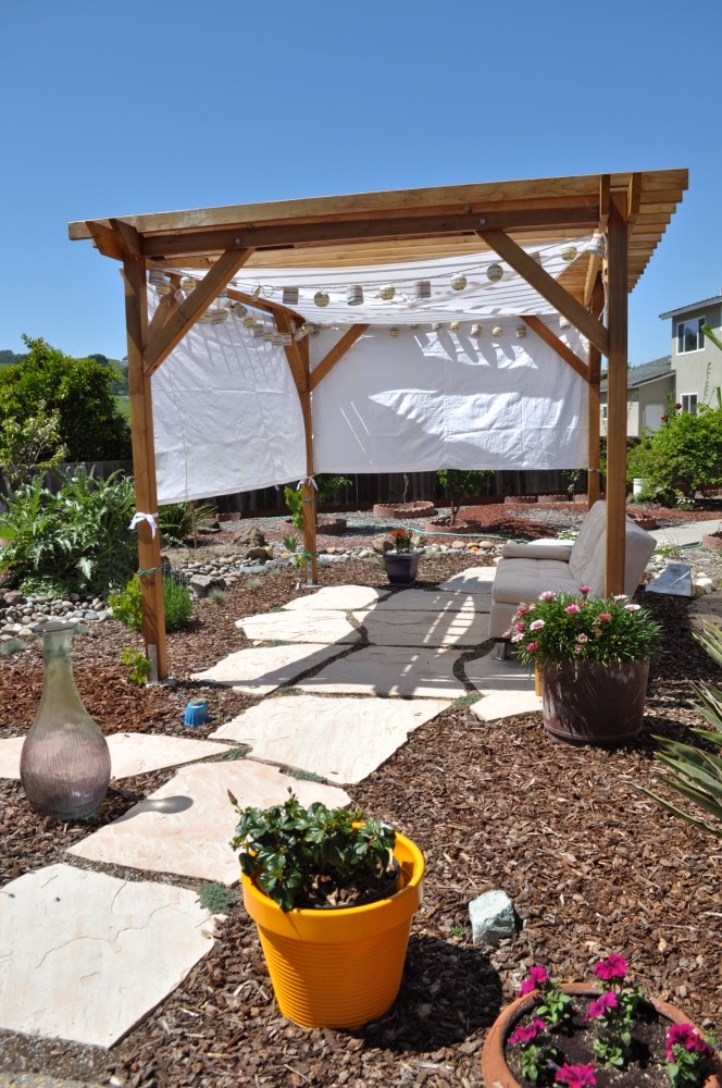 By March I decided it was now or never and I planted some woolly thyme to fill in between the pavers, I also planted some blue fescue grasses and a couple of lavenders that were actually volunteers from a huge one we already had. I planted two grape vines on the pergola and made a shade out of old curtain material that should keep us cool until the grapes grow in.