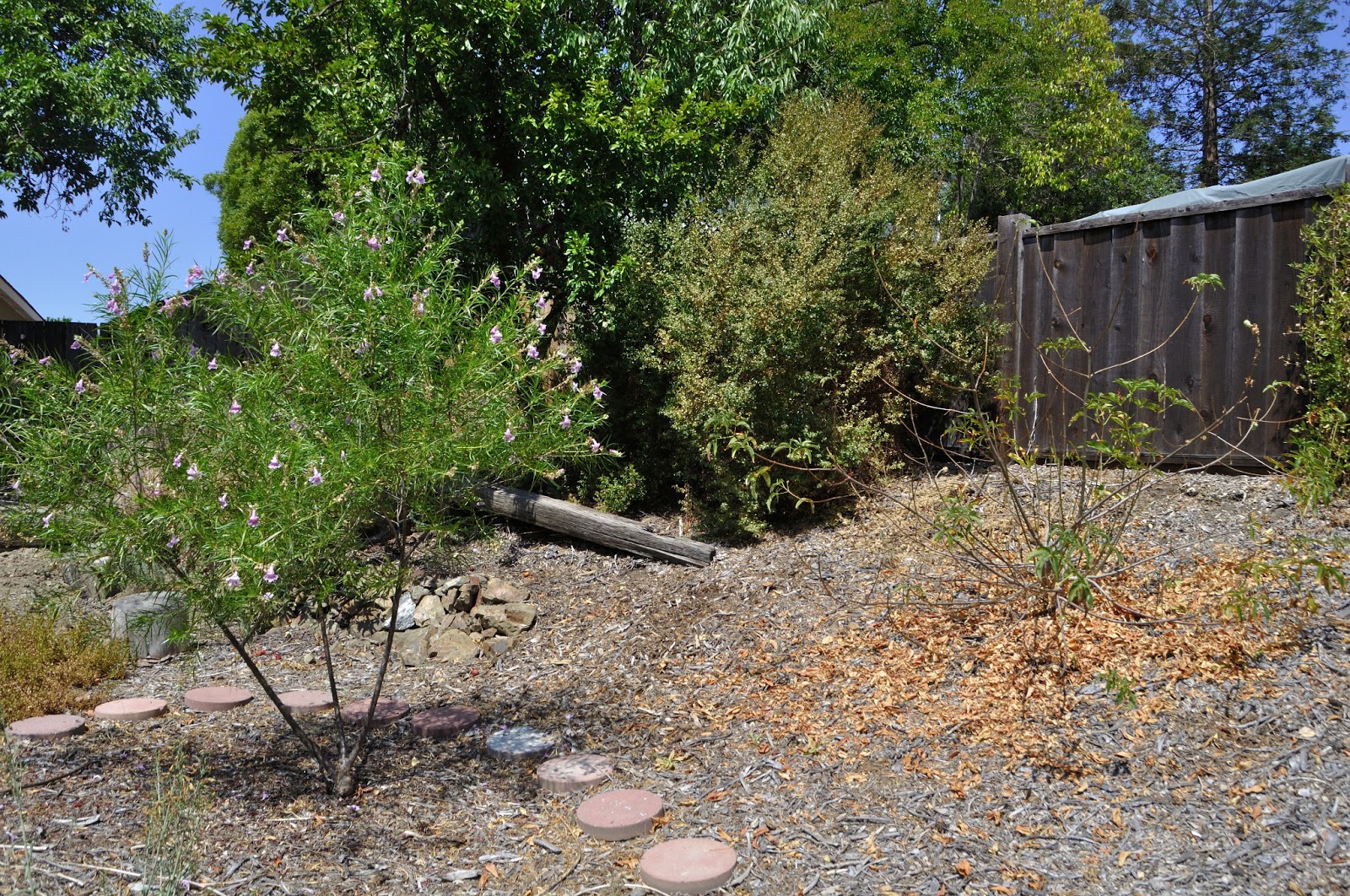 To its left is the beautiful dessert willow. When this garden has matured, nether of these trees should be in full leaf at the same time, giving a sense of space to the area. In the summer the dessert willow will provide shade and color, and when fully grown should be about thirty feet tall. There are some great drought tolerant natives - its just a matter of finding the one that suits your needs.