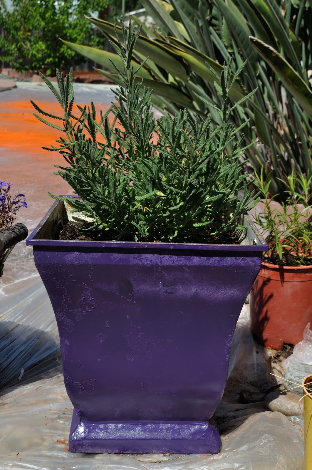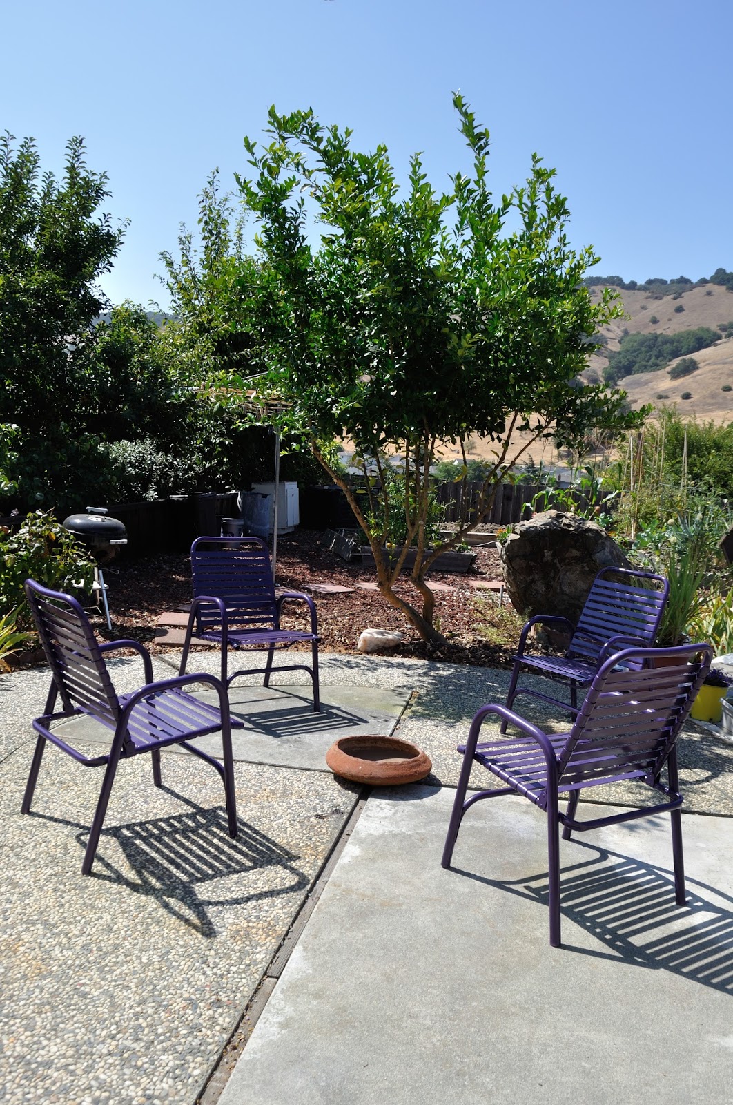 Then I decided I could tackle the fire pit chairs and settled on a nice purple for them after yet another trip to my buddies in OSH. The fire pit still hasn't arrived, so for the photo I used a terracotta pot which is about a third the size of the metal fire pit I chose from amazon. I'm looking forward to shopping for nice throws to go with these.