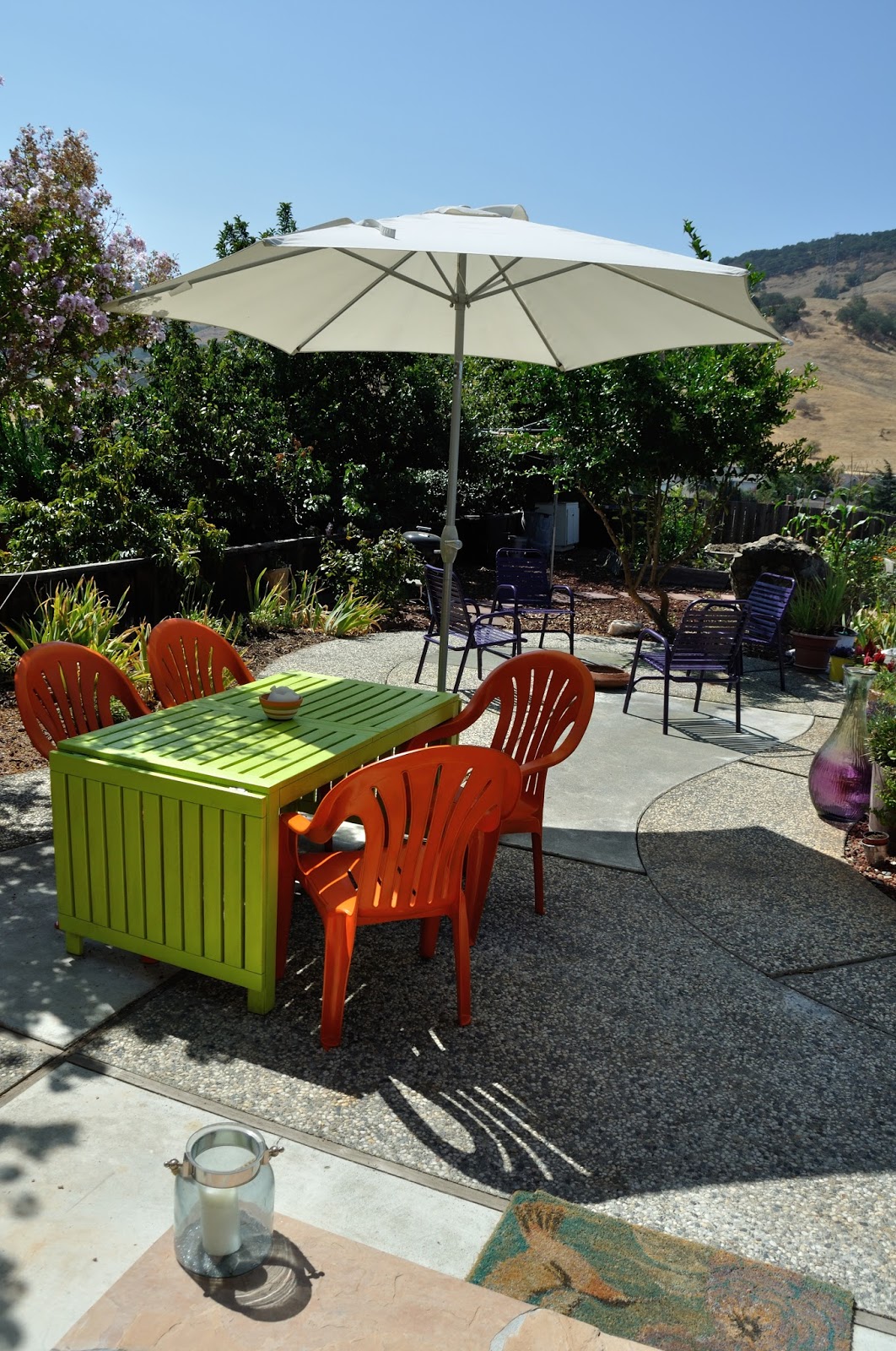 Then I tried to paint the first green chair orange and one can only covered half the chair! Still it was cheaper than buying a new chair, especially if I got a chair in the color I wanted for $7. I went straight back to OSH and bought seven more cans of orange (for the four green chairs) and a couple more cans of green for the table. The guys in the store were teasing me and warned they would be looking out for graffiti in these colors along the highways!