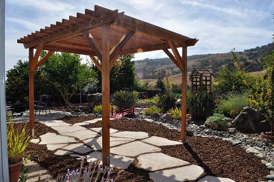 This structure is probably sturdier than our house. You can hang a swing from it. In fact, Jimmy and Steve swung hand-over-hand like moneys from it to prove how strong it was. They are both over 6'4! When the big earthquake comes it will be the only thing standing on our property. Jimmy did an amazing job, with great attention to detail, making sure that I got exactly what I had envisioned in my head. If anyone who lives in Santa Clara wants more details, send me a comment (not for publishing online) and I'll put you in touch with him.With the pergola built, the next step was to get the sandstone pavers. My Husband and I went to Evergreen Supplies, a family run business near us in San Jose. Everyone who works there claims to be one of a squad of brothers...even the girls. Okay, I jest...