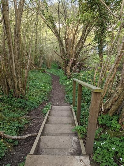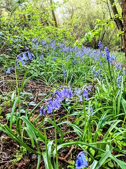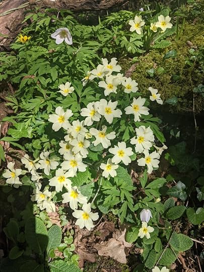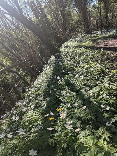At the minute, white wood anemone flowers tumble down the hillside colliding with the more stately bluebells and the demure primroses clustered on banks and around tree roots.