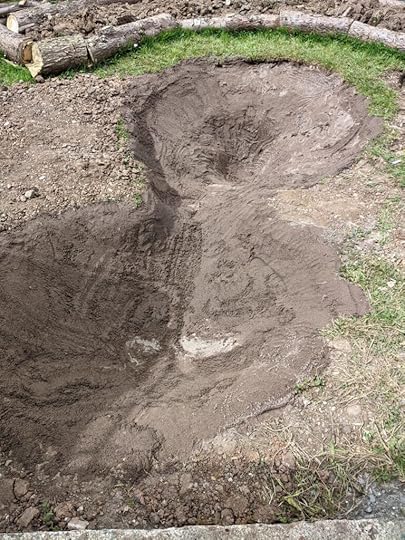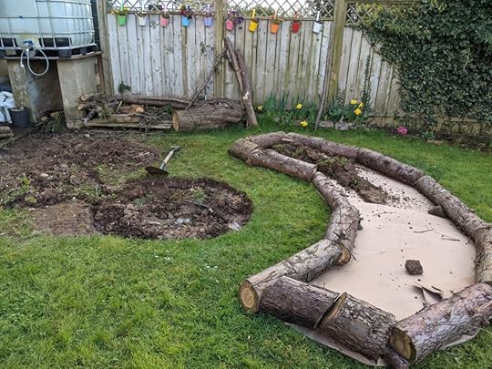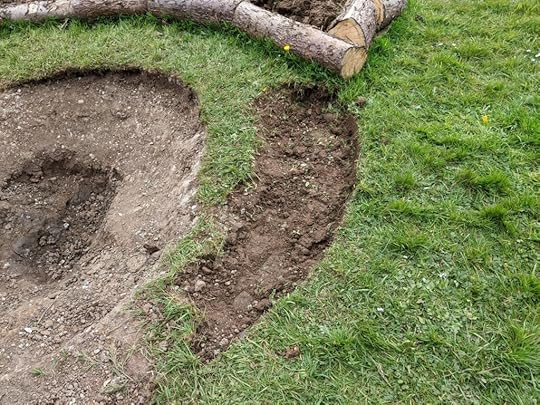 The first thing was to outline the size and shape I wanted. Rain tended to gather in the bits I dug out, so I kept a log in the hole in case the hedgehog fell in and needed to climb out.