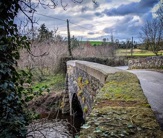 At the Red Barns, you can stay on the Rock Road for the longer (more picturesque) loop. You’ll pass a little graveyard on the right. It is a peaceful place and worth a visit if you like that kind of thing. Strolling up the Rock Road the gradient steepens, and you come to a turn off on the right-hand side. You’ll see two gates and three pillars. This is where you turn right off the Rock Road. It’s a charming wee lane that doesn’t seem to have a name on the maps. Two big hills, one after the other gets the heart rate going. The stone bridge in the hollow between them is a lovely spot to rest, and take in the scenery of the Butterwater River. You might even see the grey heron on his fishing spot, and the area is also popular with Little Egrets. Overhead you might see a Common Buzzard circling as it hunts for prey. The fields are home to sheep, and the lambs are already appearing.