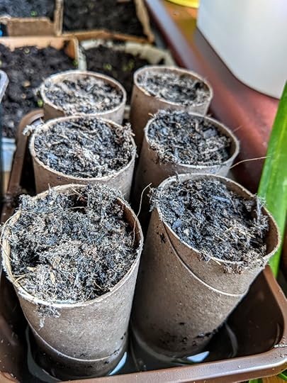 I also planted some wildflower seeds. We have an area of lawn that I’ve not mown since an unfortunate incident between a frog and a lawnmower. We call the area Frog Meadow to honor those who lost their lives. Anyway, you can’t just throw wildflower seeds on top of long grass – well, you can, but they won’t grow! So I put a layer of soil on some cardboard using the disintegrating cardboard principle and plan to just set it out on top of the grass allowing the flowers to grow in their own space before they need to compete with grass – a kind of social distancing for plants, I guess.
